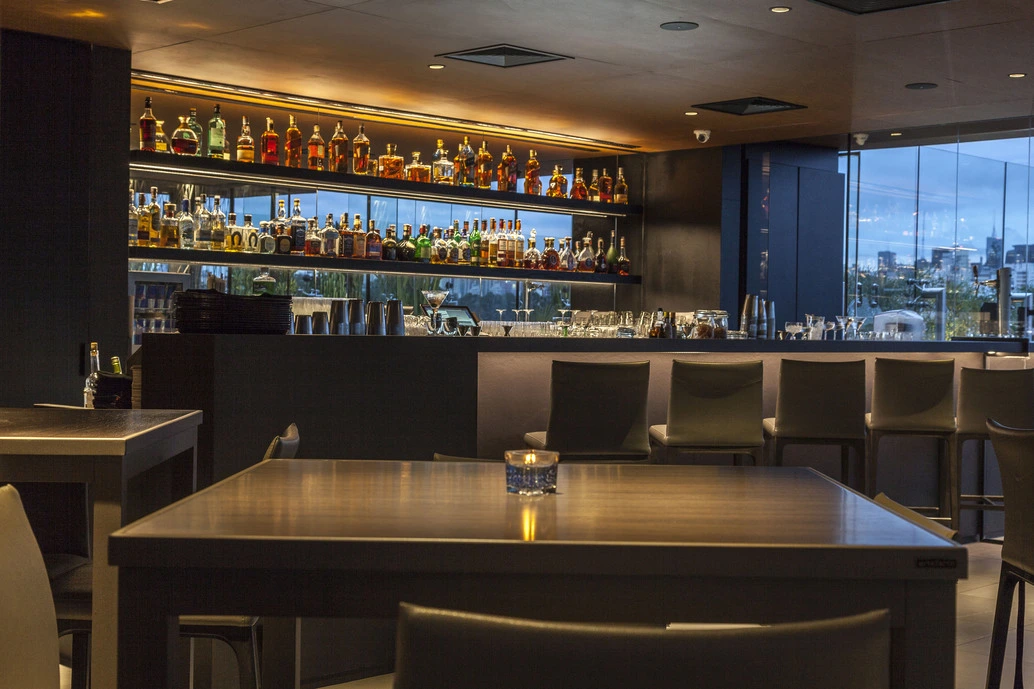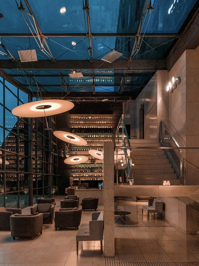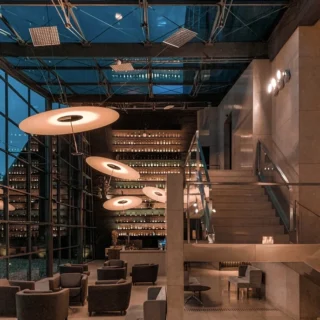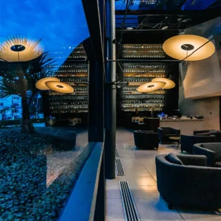 Sua grande marca é uma imponente parede vertical repleta de garrafas, adjacente a uma biblioteca com mais de 300 títulos, incluindo obras sobre design, arquitetura, arte, moda, música e fotografia.