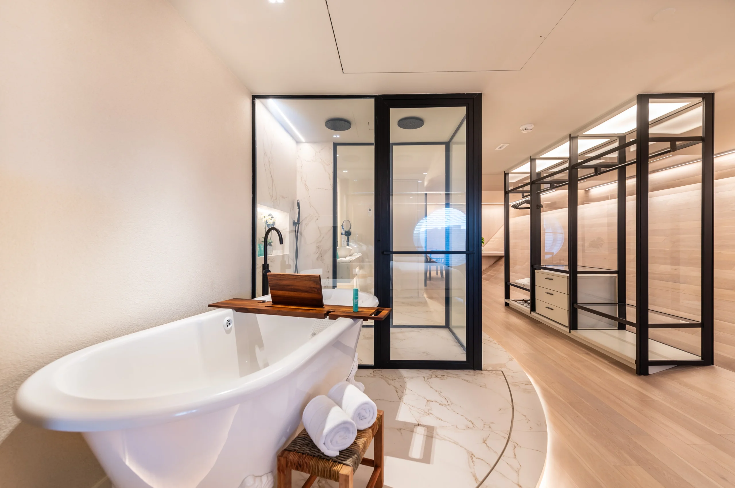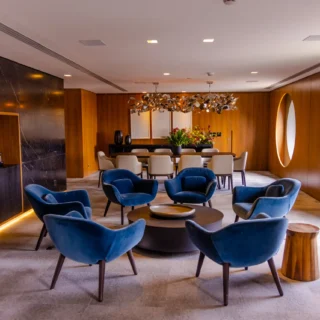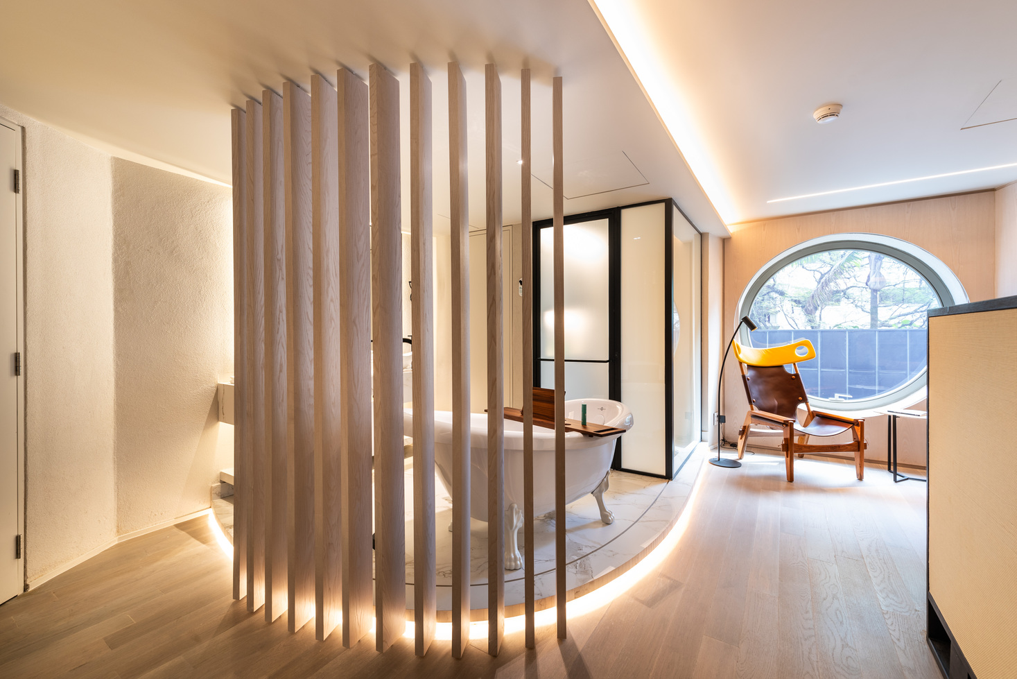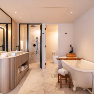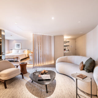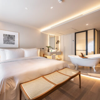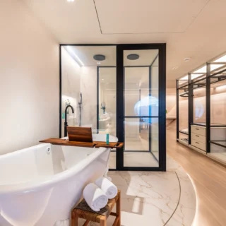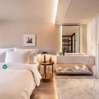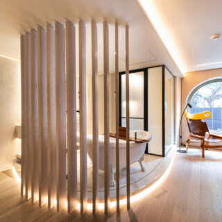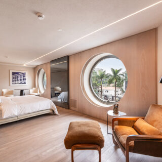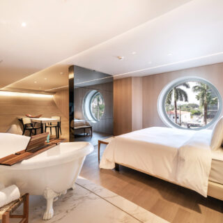Suíte exclusiva com 60 m², que se destaca por suas duas emblemáticas janelas redondas no mesmo ambiente, verdadeiros “olhos do hotel” voltados para a cidade. As elegantes poltronas convidam a momentos de pausa, conforto e contemplação. O espaço amplo abriga uma cama super king size, criando uma atmosfera extremamente aconchegante e envolvente. Integrada ao quarto, a banheira em estilo vitoriano é um elemento especial e diferenciado, que torna a experiência ainda mais exclusiva e memorável. As suítes Mayfair estão localizadas no: 3º, 4º, 6º e 7º.
