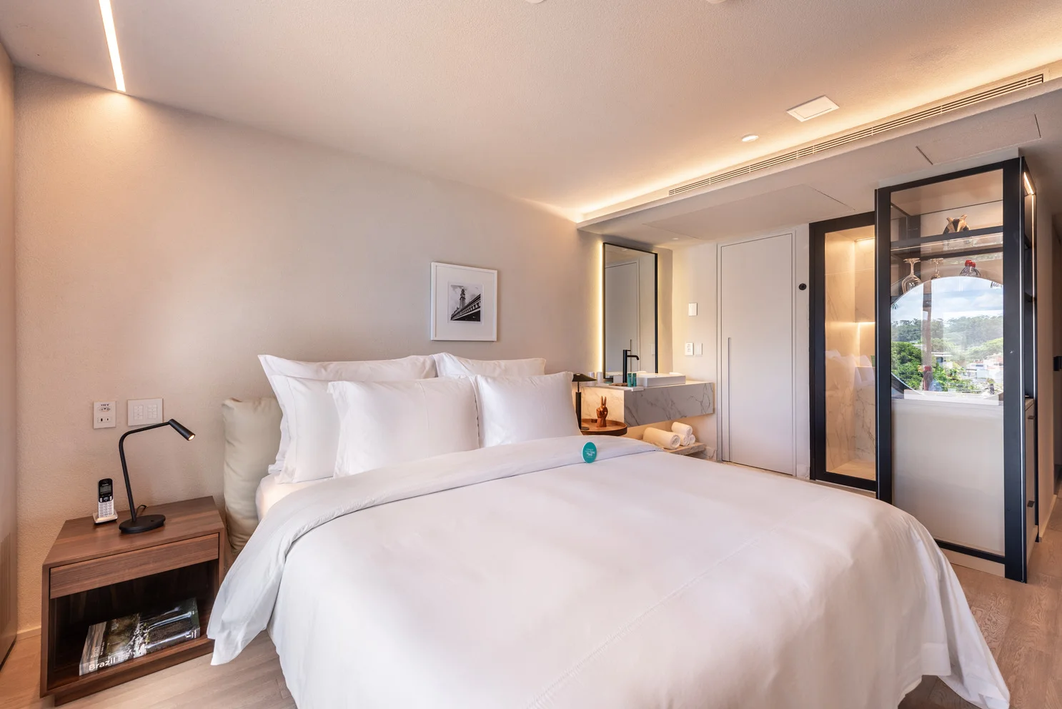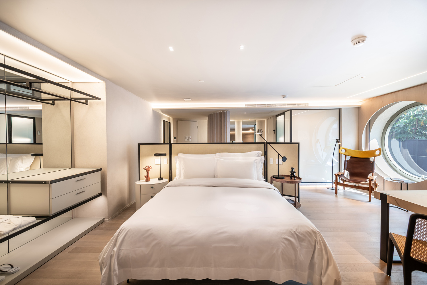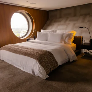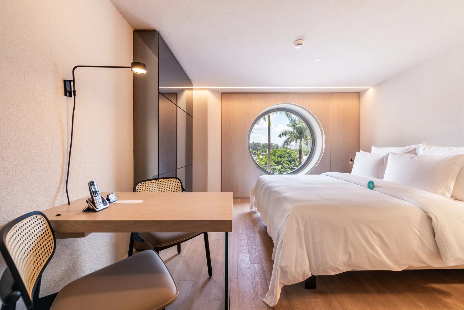 Com uma arquitetura arrojada, que reflete as curvas dos corredores do hotel, as acomodações presenteiam os hóspedes com vistas do Parque Ibirapuera ou da ampla área verde da região dos Jardins, que podem ser observadas através das janelas circulares. A confortável cama queen size e a decoração minimalista também são pontos altos da experiência.