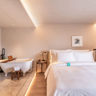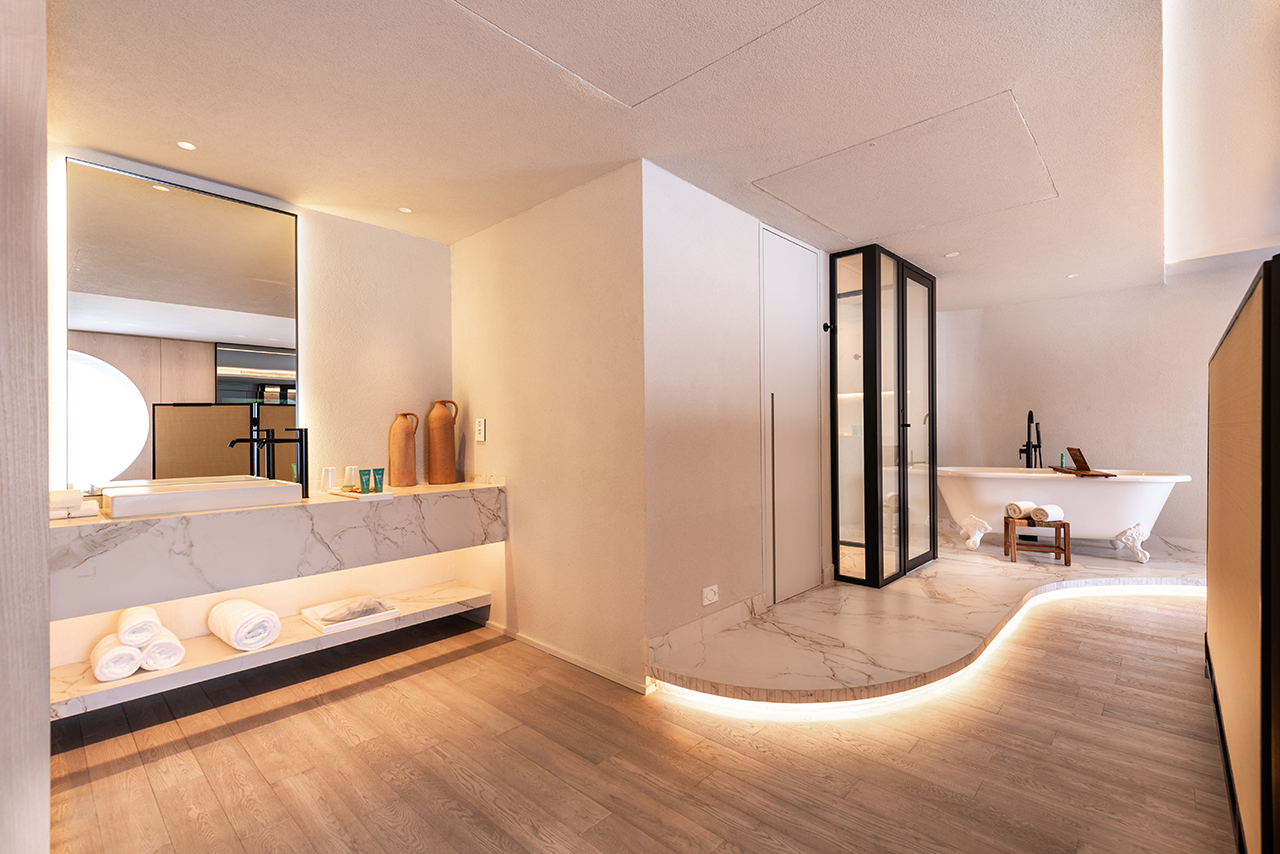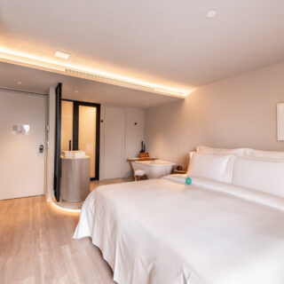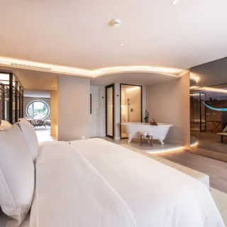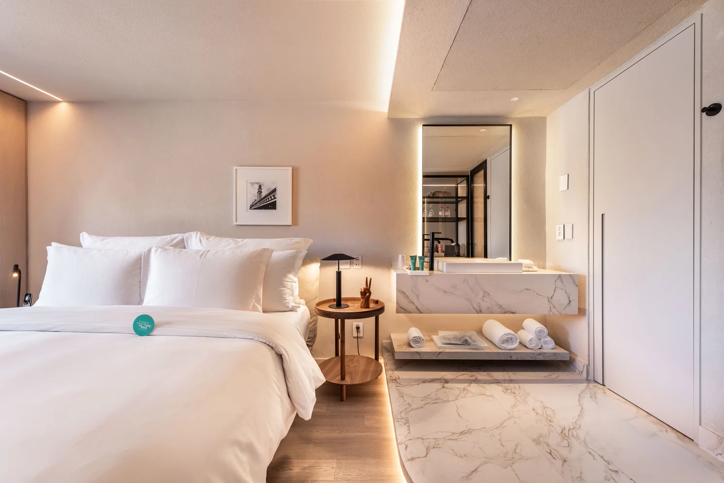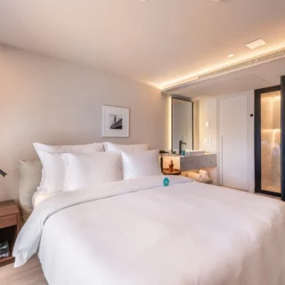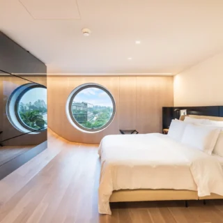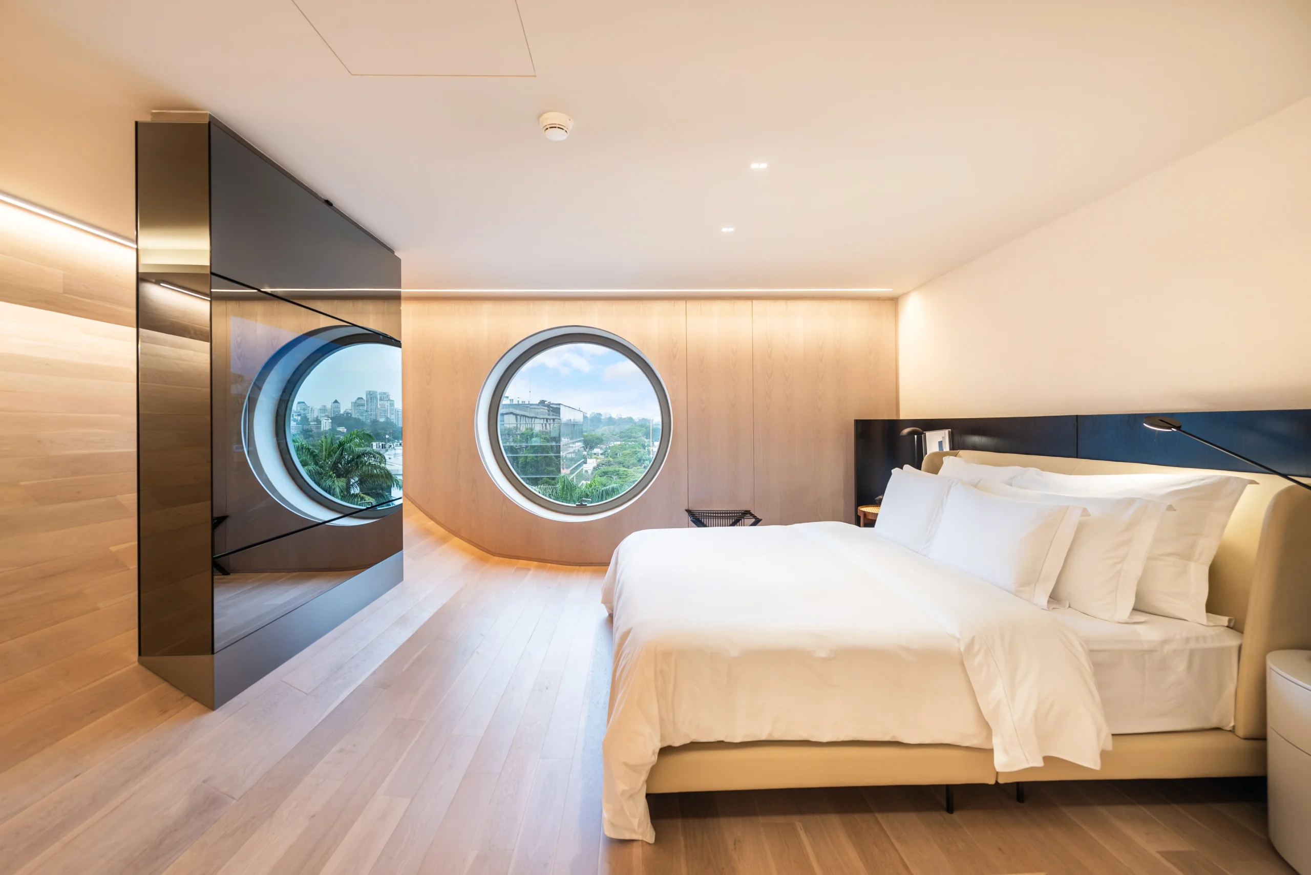 Com uma arquitetura arrojada, que reflete as curvas dos corredores do hotel, as acomodações presenteiam os hóspedes com vistas do Parque Ibirapuera ou da ampla área verde da região dos Jardins, que podem ser observadas através das janelas circulares. A confortável cama queen size e a decoração minimalista também são pontos altos da experiência.