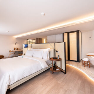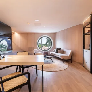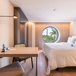 A acomodação Deluxe foi projetada com um design elegante que privilegia o conforto e possui uma área de trabalho que compartilha harmoniosamente o espaço com uma cama queen size, ambas sob a luz natural proveniente da grande janela em forma de círculo que adorna as paredes.