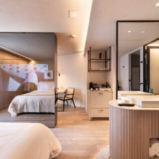Com um projeto que privilegia a privacidade, a suíte Rodeo Drive conta com sala de estar e quarto em ambientes separados – ambos com mesa de trabalho – sem abrir mão do design e conforto.