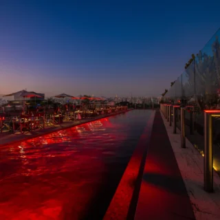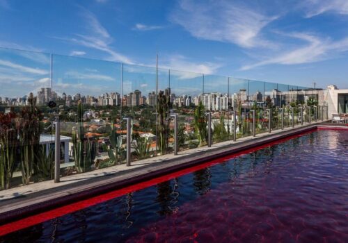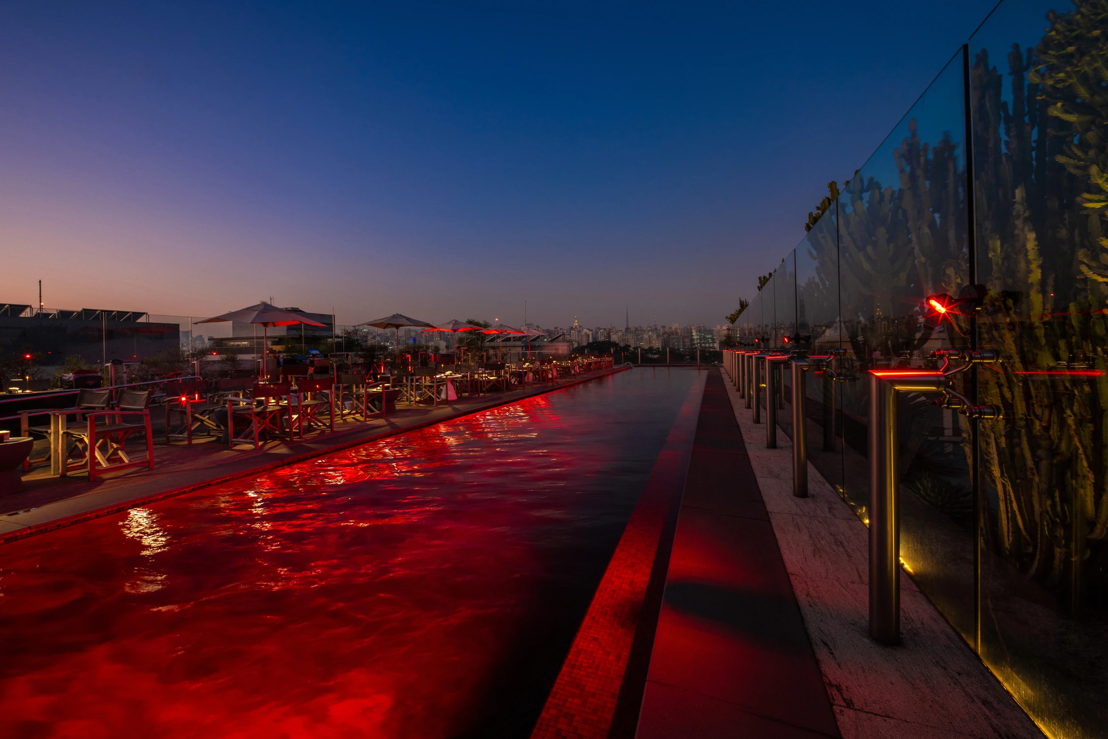 Localizado na cobertura do hotel, o Skye possui uma piscina avermelhada e um fabuloso lounge com vista panorâmica para o Parque Ibirapuera e todo o horizonte de São Paulo, incluindo o skyline da Avenida Paulista.