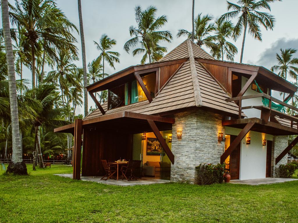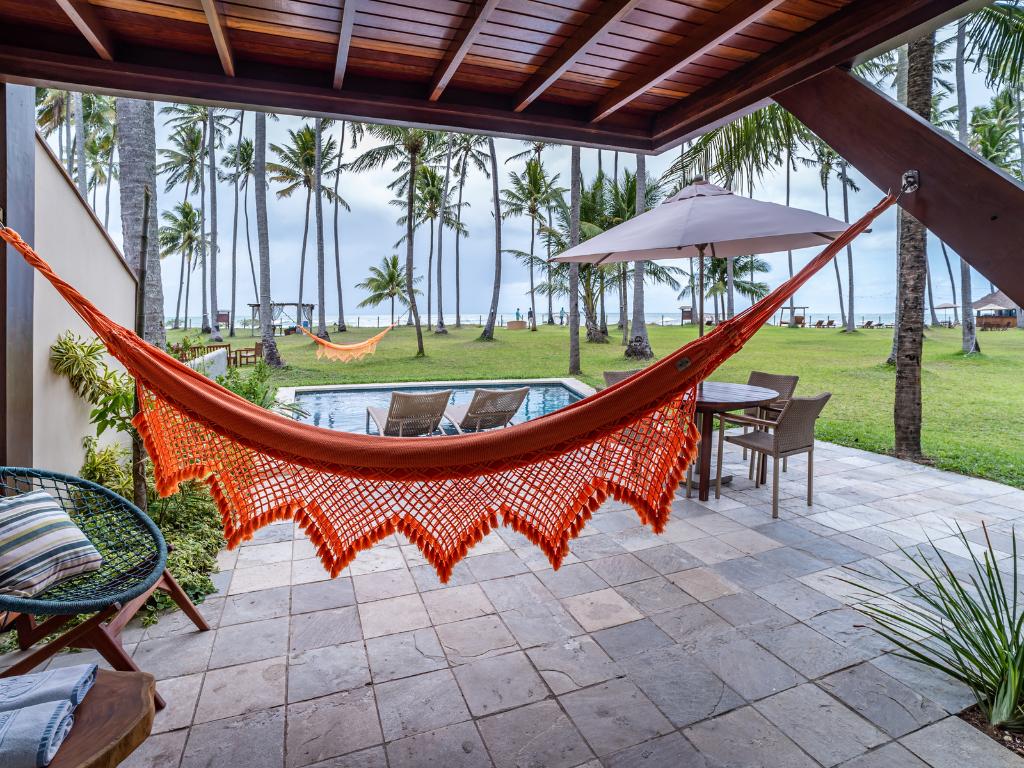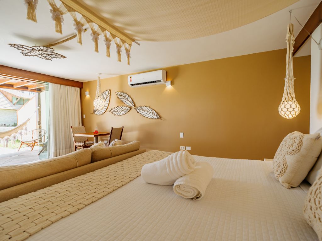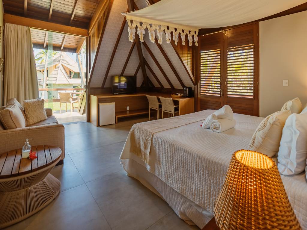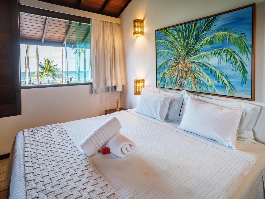 No térreo ou no 1º andar. Suítes com 55 m², dispondo de: banheira de hidromassagem, cama box king size, enxoval 100% algodão, travesseiros de plumas de ganso amenities L’Occitane en Provance, secador de cabelos, TV LED 40 ″, SKY HDTV, DVD player, frigobar , máquina de café, varanda com rede e vista para o mar.