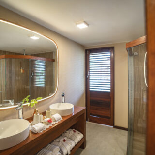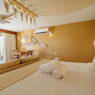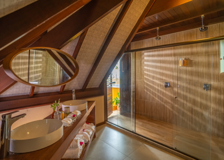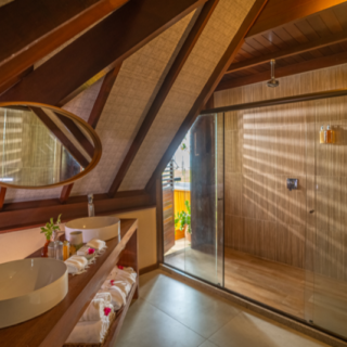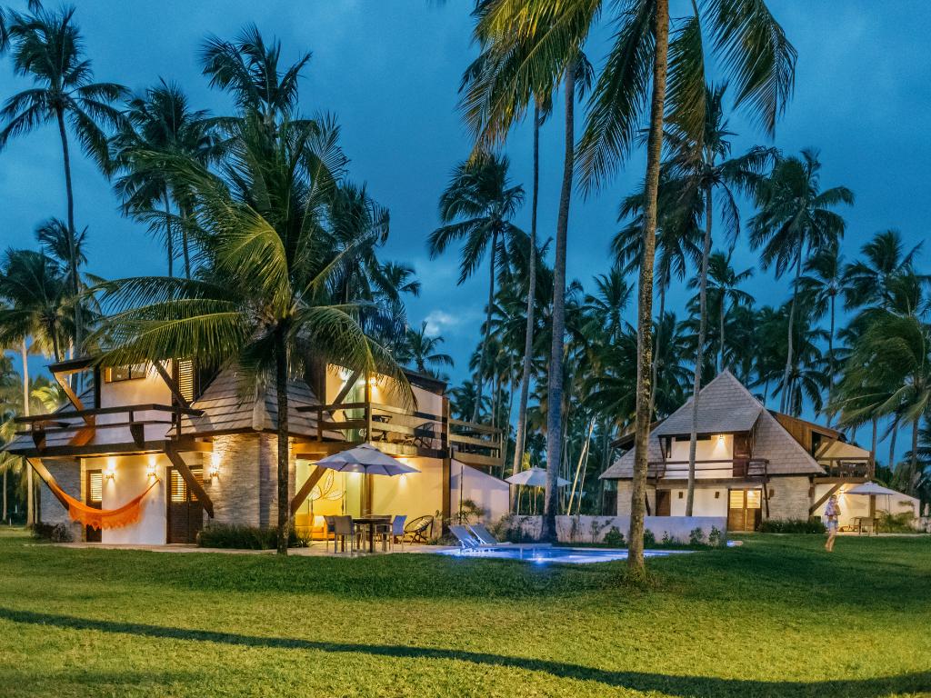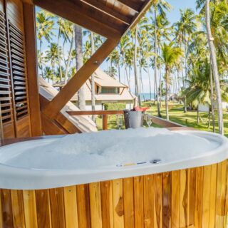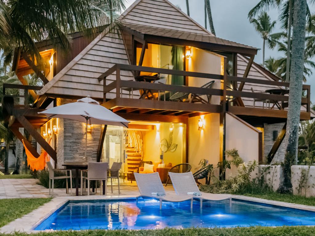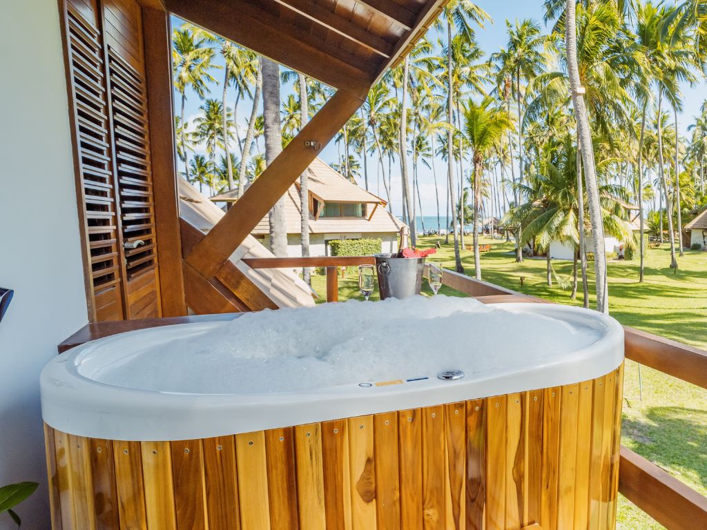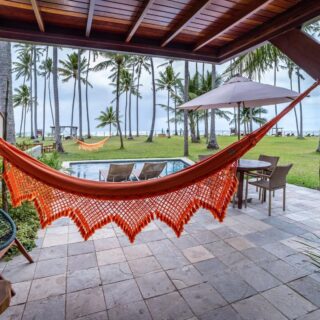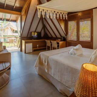 No térreo ou no 1º andar. Suítes com 55 m², dispondo de: banheira de hidromassagem, cama box king size, enxoval 100% algodão, travesseiros de plumas de ganso amenities L’Occitane en Provance, secador de cabelos, TV LED 40 ″, SKY HDTV, DVD player, frigobar , máquina de café, varanda com rede e vista para o mar.